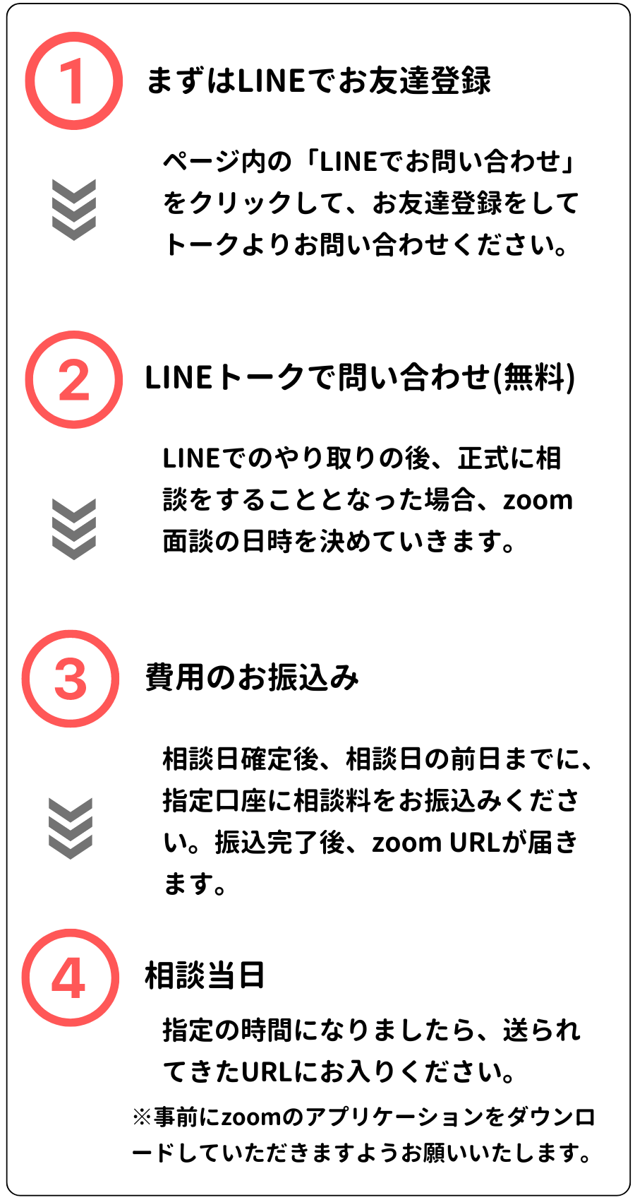 本サービスは上記の金額以外一切発生いたしません。「基本無料」「30分だけ無料」「会員登録が必要」などと言ったややこしい料金システムもなく、また弁護士ではないのでどこよりもお手頃な金額で相談に承れます。